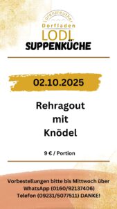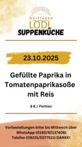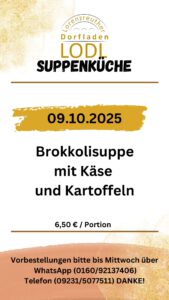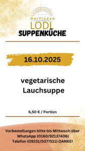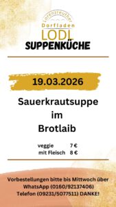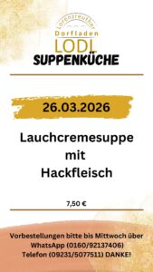Donnerstag ist Suppentag bei uns. Wir bieten Ihnen eine monatlich wechselnde Vielfalt aus unserer Suppenküche. Natürlich hausgemacht und regional! Natürlich können vorbestellte Suppen jederzeit mitgenommen werden. Bringen Sie hierzu der Umwelt zu Liebe einfach ein eigenes Gefäß mit.